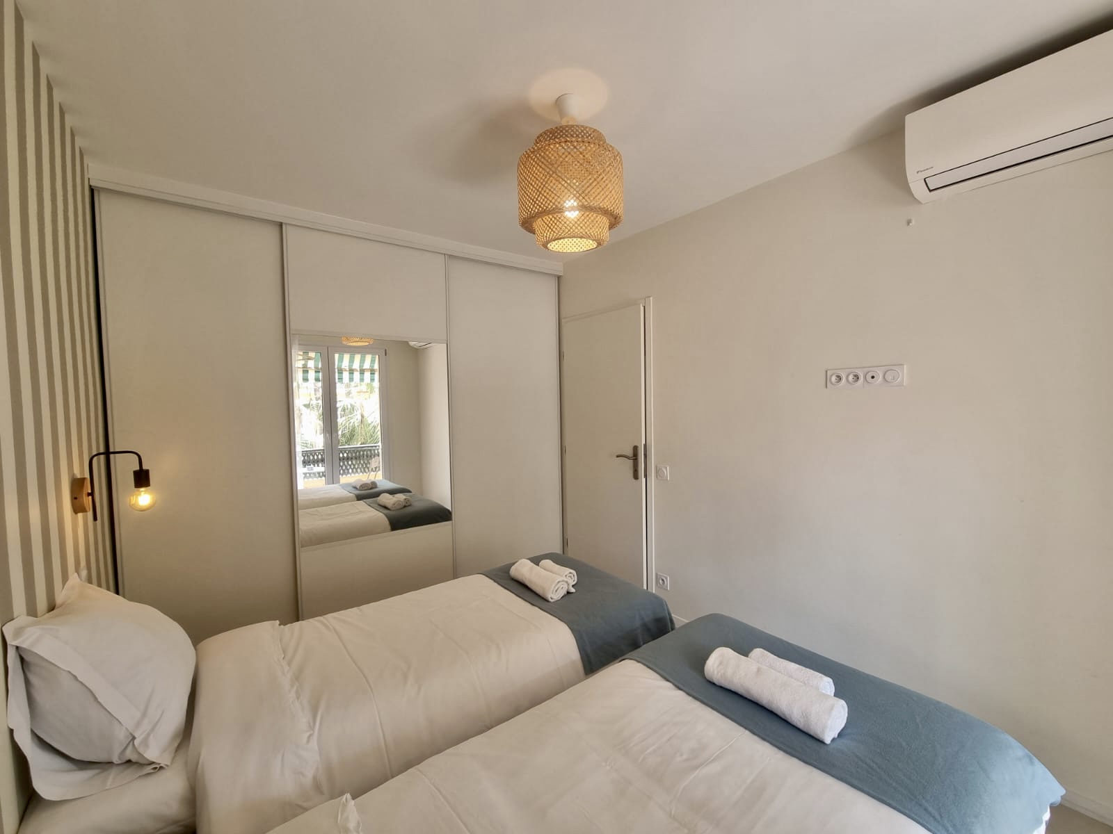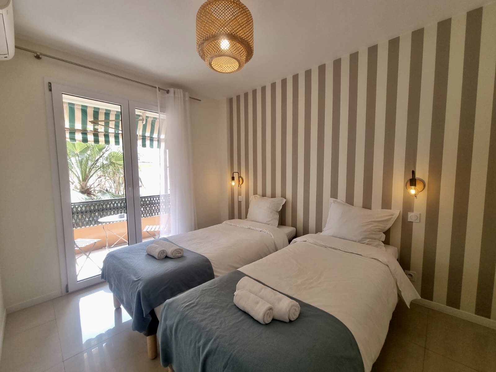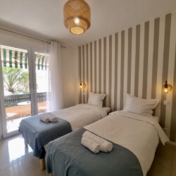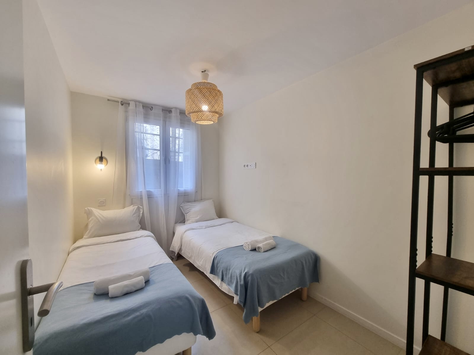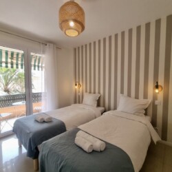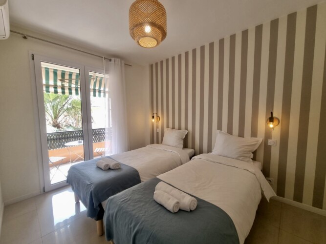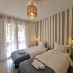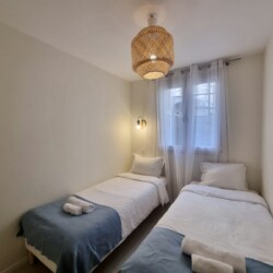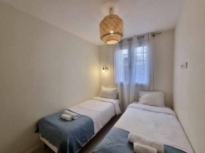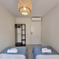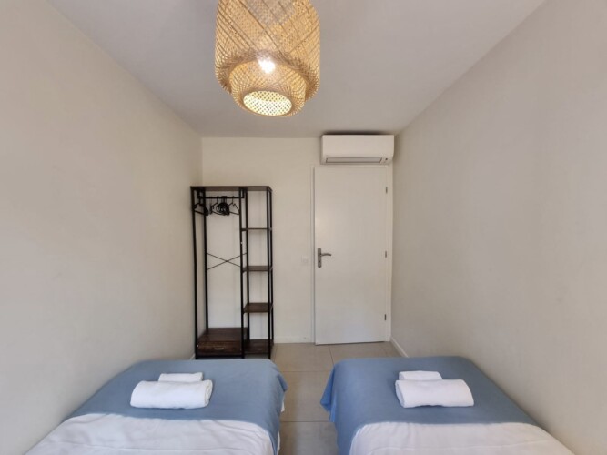Équipement : 4 lits simples de 90×200, 1 canapé-lit, climatisation, lave-linge, lave-vaisselle, cuisine équipée, table à manger, linge de maison, couverts et vaisselle, fer à repasser, cafetière, four, micro-ondes, TV, internet.
